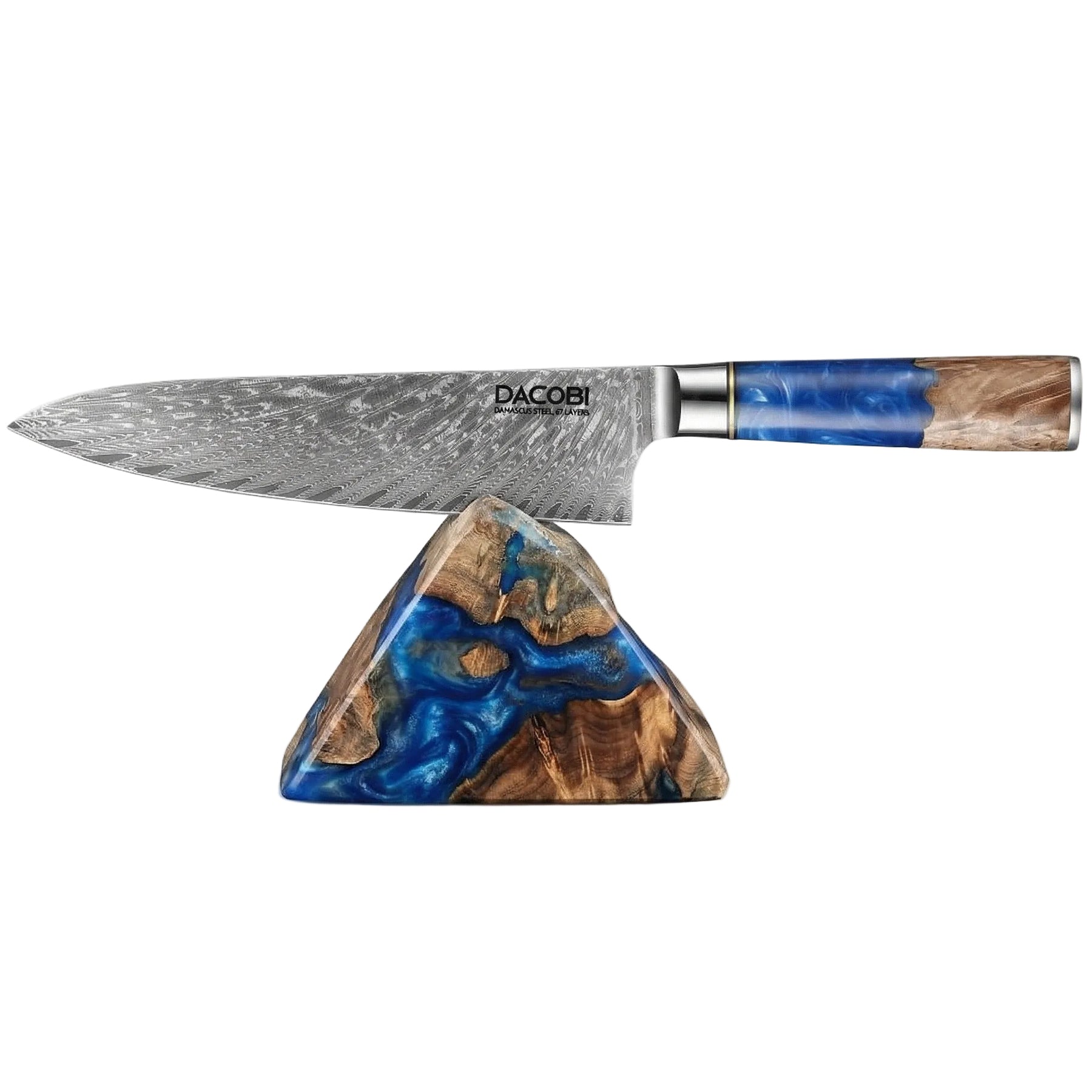 DACOBI C1 er en kokkekniv, der blander kunst og funktion. Den er lavet af Damaskus-stål, som er kendt for sin styrke, skarphed og unikke mønster. Klingen har en V-formet kant, der let kan glide gennem enhver mad. Håndtaget er lavet af blå harpiks og træ, som tilføjer et strejf af elegance og charme. C1 er en professionel kokkekniv, der vil glæde dig med sin kvalitet og stil. Gå ikke glip af denne mulighed for at eje en DACOBI-kniv, der er lige så smuk, som den er praktisk.